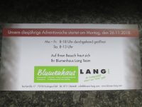 Wir sind in unserer Adventswoche ( 26.11.-30.11) für Sie Montag – Freitag von 8.00Uhr-18.00Uhr durchgehend da und