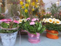 Verschiedene Frühlingspflanzen, Gefäße und Accessoires