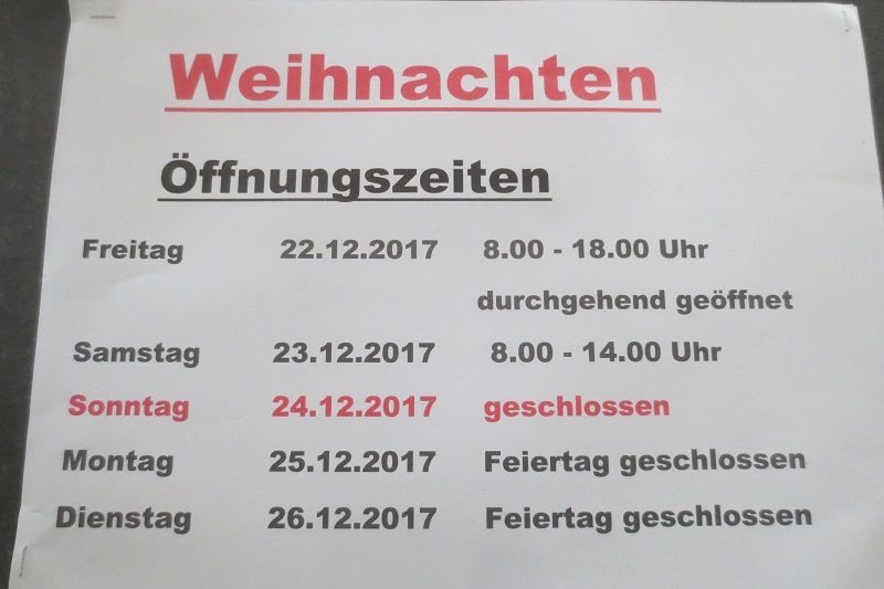 23.12.2017 Samstag von 8.00-14.00 Uhr geöffnet