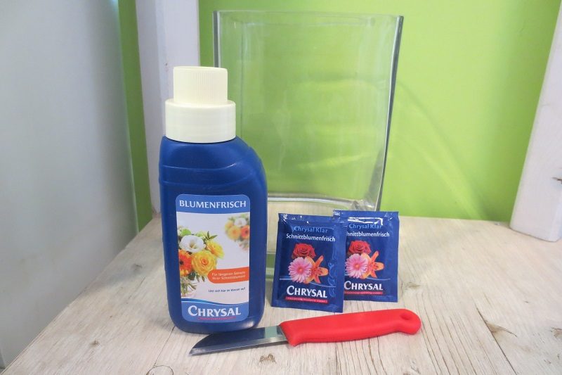Geben Sie Frischhaltemittel für Schnittblumen genau nach Packungsanleitung dosiert ins Wasser. Es versorgt die Blumen mit Mineralien und mindert den Zersetzungsprozess.